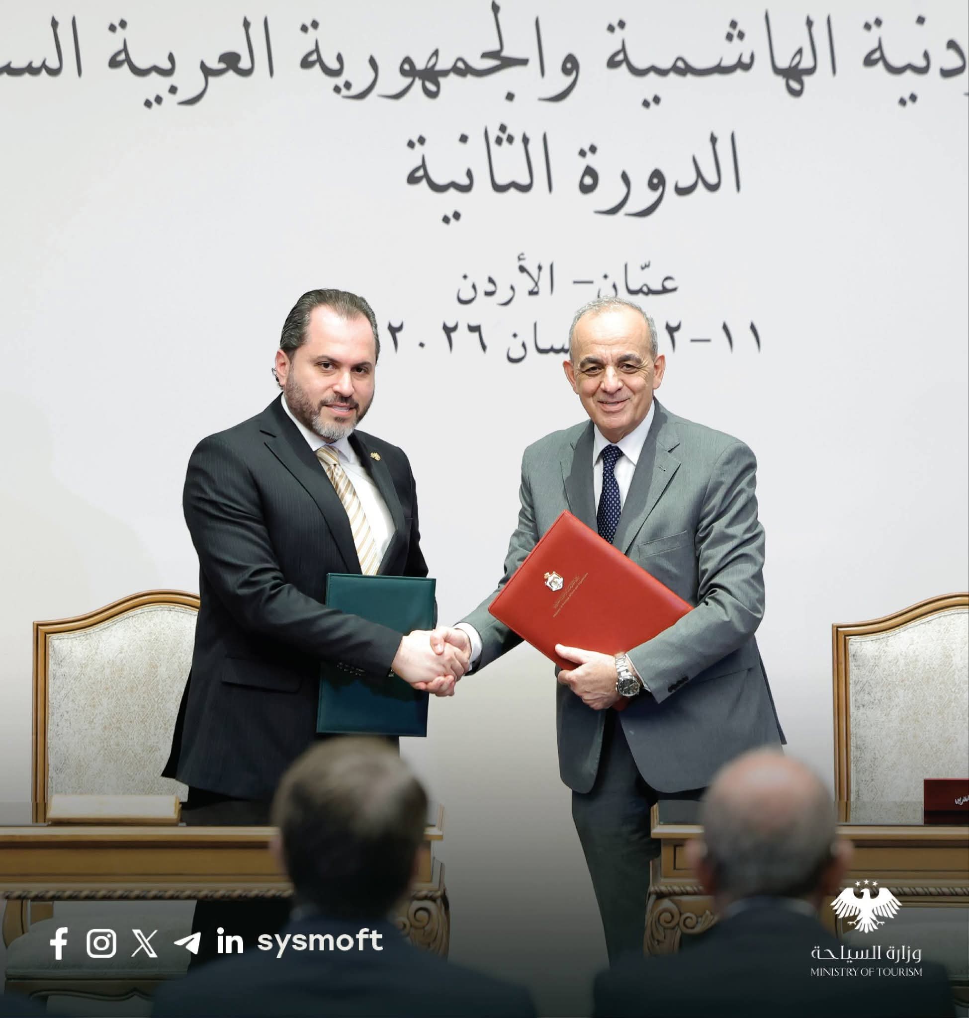 في إطار تعزيز العلاقات الثنائية وتوسيع آفاق الشراكة، وقّعت وزارة السياحة في الجمهورية العربية السورية ووزارة السياحة والآثار في المملكة الأردنية الهاشمية مذكرة تفاهم للتعاون المشترك في القطاع السياحي، وذلك على هامش أعمال الدورة الثانية لمجلس التنسيق الأعلى بين البلدين.