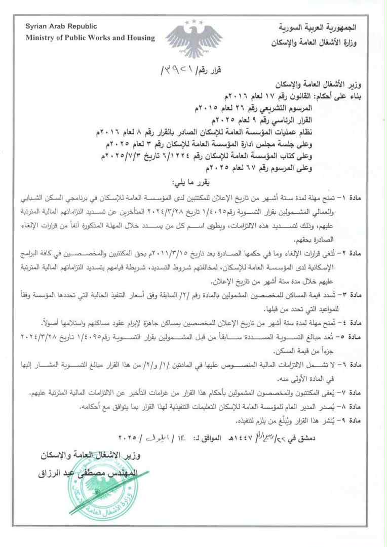 أصدر السيد وزير الأشغال العامة والإسكان المهندس مصطفى عبد الرزاق قرارًا لإنصاف المواطنين المكتتبين، والمخصصين في كافة البرامج الإسكانية لدى المؤسسة العامة للإسكان، والذين سبق أن تم إلغاء اكتتابهم أو تخصيصهم. مهلة لمدة ستة أشهر من تاريخ الإعلان للمكتتبين لدى المؤسسة العامة للإسكان في برنامجي السكن الشبابي والعمالي المشمولين بقرار التسوية رقم ١/٤٠٩٥ تاريخ ٢٠٢٤/٣/٢٨ المتأخرين عن تسديد التزاماتهم المالية المترتبة عليهم، وذلك لتسديد هذه الالتزامات، ويطوى اسم كل من يسدد خلال المهلة المذكورة آنفاً من قرارات الإلغاء الصادرة بحقهم.