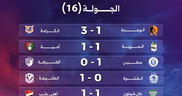 وبالنتيجة ذاتها تعادل الحرية مع أمية 1-1 على ملعب الحمدانية في حلب، إذ تقدم محمد زكور لأمية في الدقيقة 52، قبل أن يعادل عبد الرزاق البستاني النتيجة بعد أربع دقائق فقط.وفي اللاذقية، حقق حطين فوزاً صعباً على الشرطة بهدف دون رد حمل توقيع ايمن عكيل في الزقيقة 75، بينما نجح الطليعة في خطف فوز متأخر على الفتوة بنتيجة 1-0 في دير الزور، بهدف سجله بكري دياتي في الدقيقة 82.
