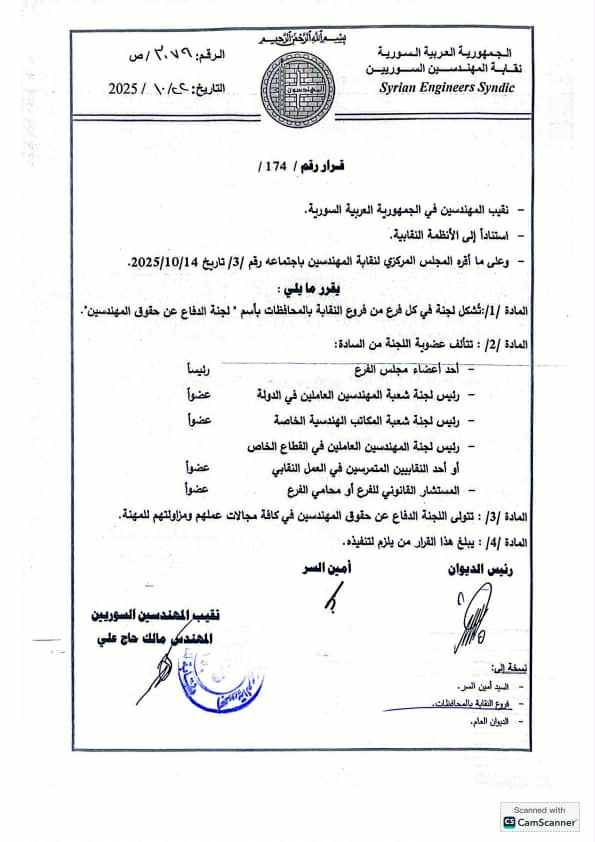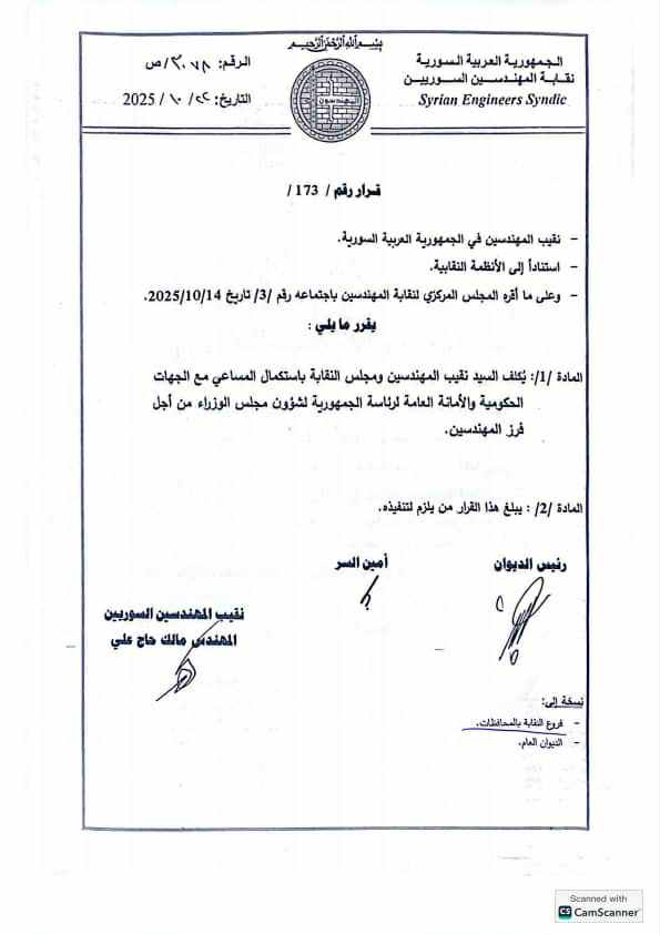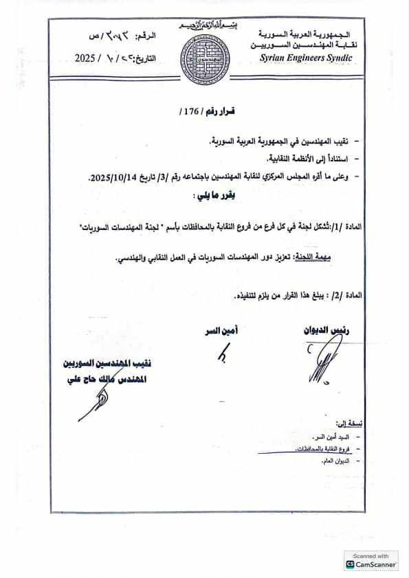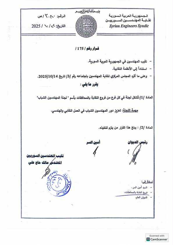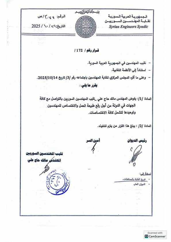 أصدر نقيب المهندسين في الجمهورية العربية السورية المهندس مالك حاج علي عدة قرارات بناء على ماأقره المجلس المركزي للنقابة في اجتماعه رقم /3/ المنعقد بتاريخ 14 تشرين الأول 2025. وذلك بهدف تعزيز دور المهندسين وتفعيل العمل النقابي
