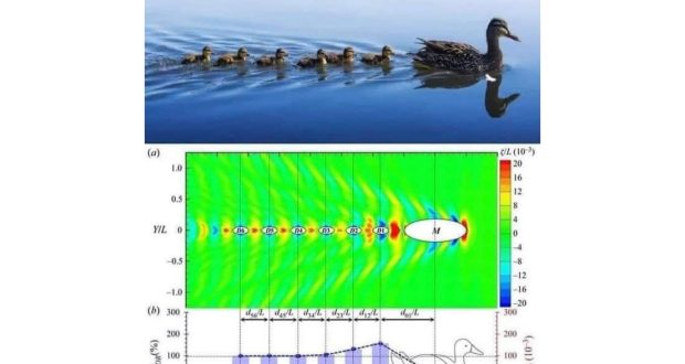 أن سباحة فراخ البط خلف أمها ليست فعلًا عشوائيًا، بل سلوكًا تحكمه غاية وحكمة دقيقة. فالأم، أثناء تقدمها في الماء، تكسر التوتر السطحي وتُولّد موجات دافعة يستفيد منها صغارها. ومن خلال ركوب هذه الموجات وانتقالها إليهم، يتكوّن سحب موجي وتوازن ديناميكي يساعد الفراخ على الحركة بثبات أكبر. وبهذا تُسهَّل عليهم السباحة ويقل الجهد والطاقة التي يستهلكونها.