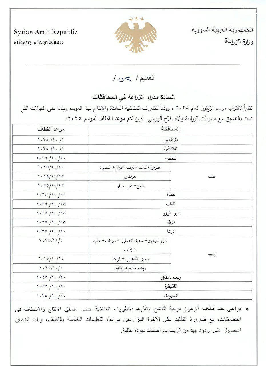 حددت وزارة الزراعة مواعيد بدء قطاف الزيتون لهذا العام في المحافظات السورية، وذلك وفقاً للظروف المناخية السائدة وتقديرات إنتاج هذا الموسم، وبناء على الجولات التي تمت بالتنسيق مع مديريات الزراعة.